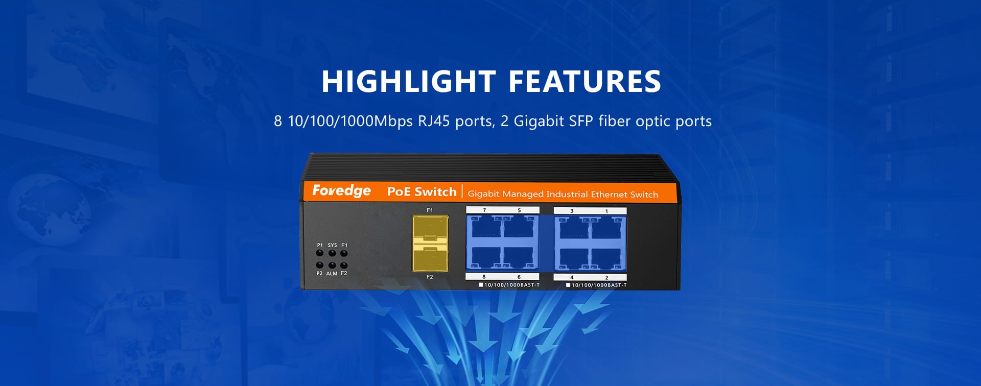 | Performance | ● Power Indicator:P1,P2 ● System Indicator:SYS ● Alarm Indicator:ALM ● SFP Port Indicator:Link&Act F1~F2 ● RJ45 Port Indicator:POE&Link&Act 1~8 |