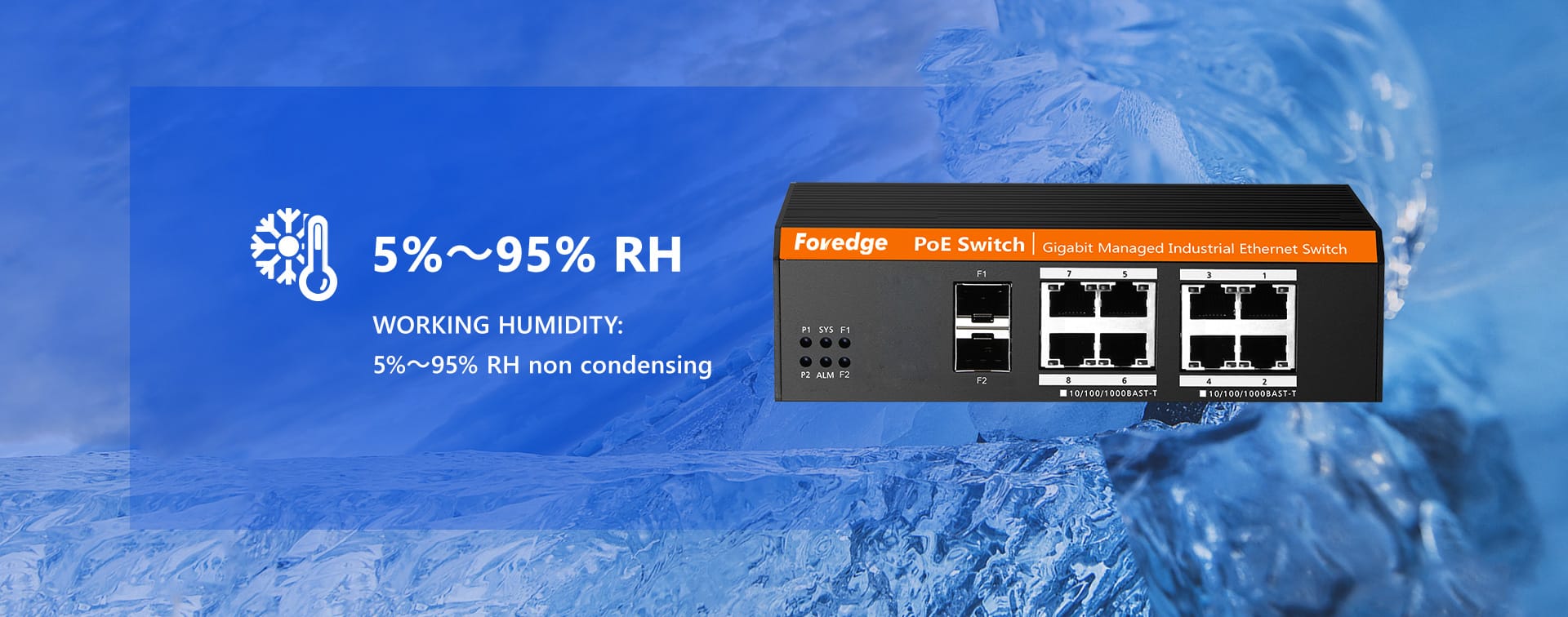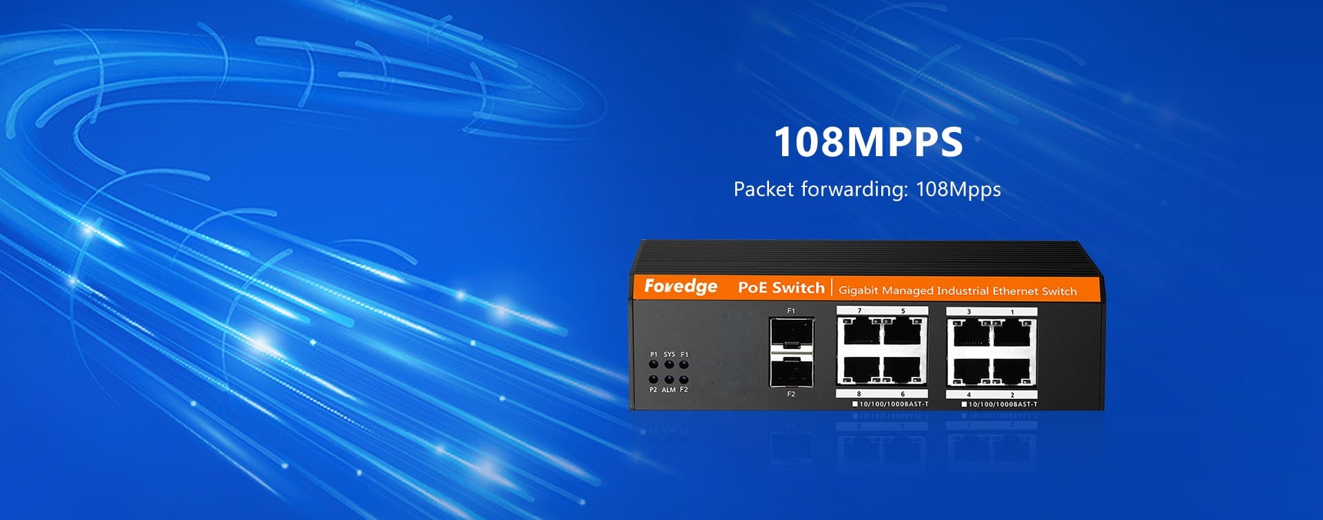 | LED Indicator | ● Power Indicator:P1,P2 ● System Indicator:SYS ● Alarm Indicator:ALM ● SFP Port Indicator:Link&Act F1~F2 ● RJ45 Port Indicator:POE&Link&Act 1~8 |
