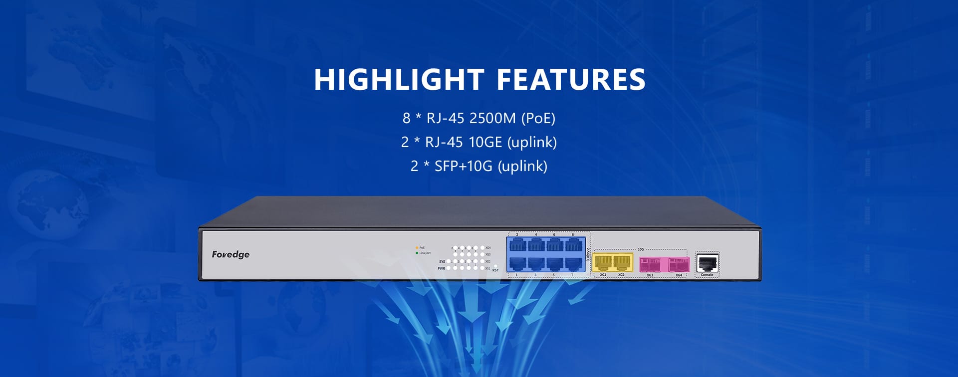 8 * RJ-45 2500M (PoE) 2 * RJ-45 10GE (enlace ascendente) 2 * SFP+10G (enlace ascendente)