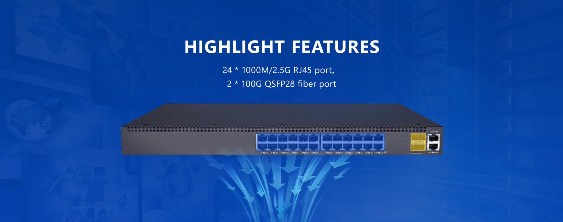 24 * puertos RJ45 1000M/2.5G, 2 * puertos de fibra QSFP28 100G