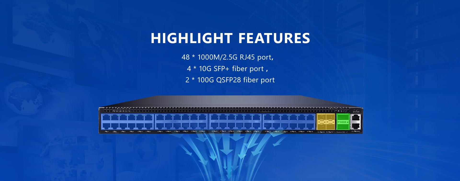 | Network Interface | ● 48*1000M/2.5Gbps RJ45 ports ● 4*10G SFP+ ports ● 2*40G QSFP+ ports ● 1*Console port |